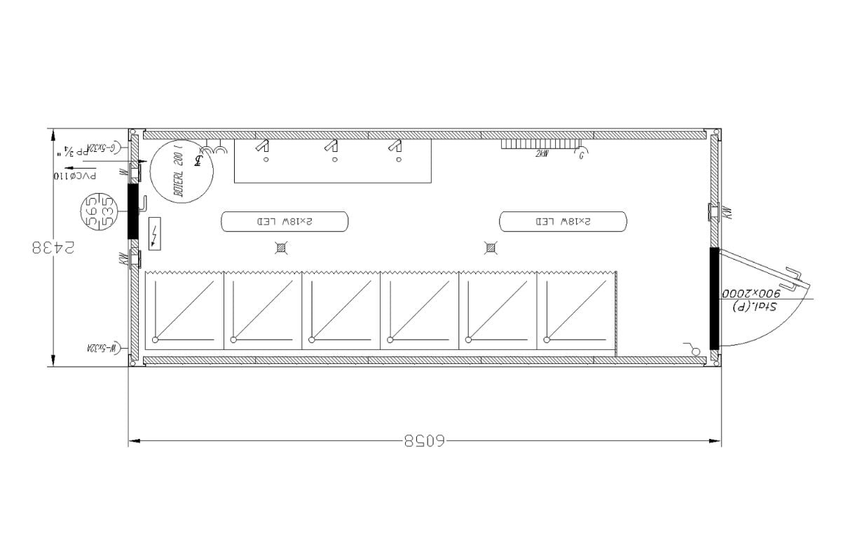 DUŠO KABINĖLĖS MATMENYS: Lz = 6058 mm, Sz = 2438 mm, Hz = 2800 mm, Hw = 2500 mm